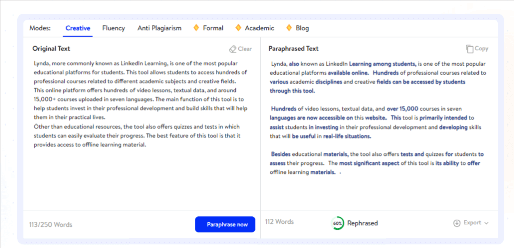 With the help of this online paraphrasing tool, business owners can not only repurpose existing content but also improve the quality and readability of their promotional material, enhance creativity in social media posts, and formalise official communications.