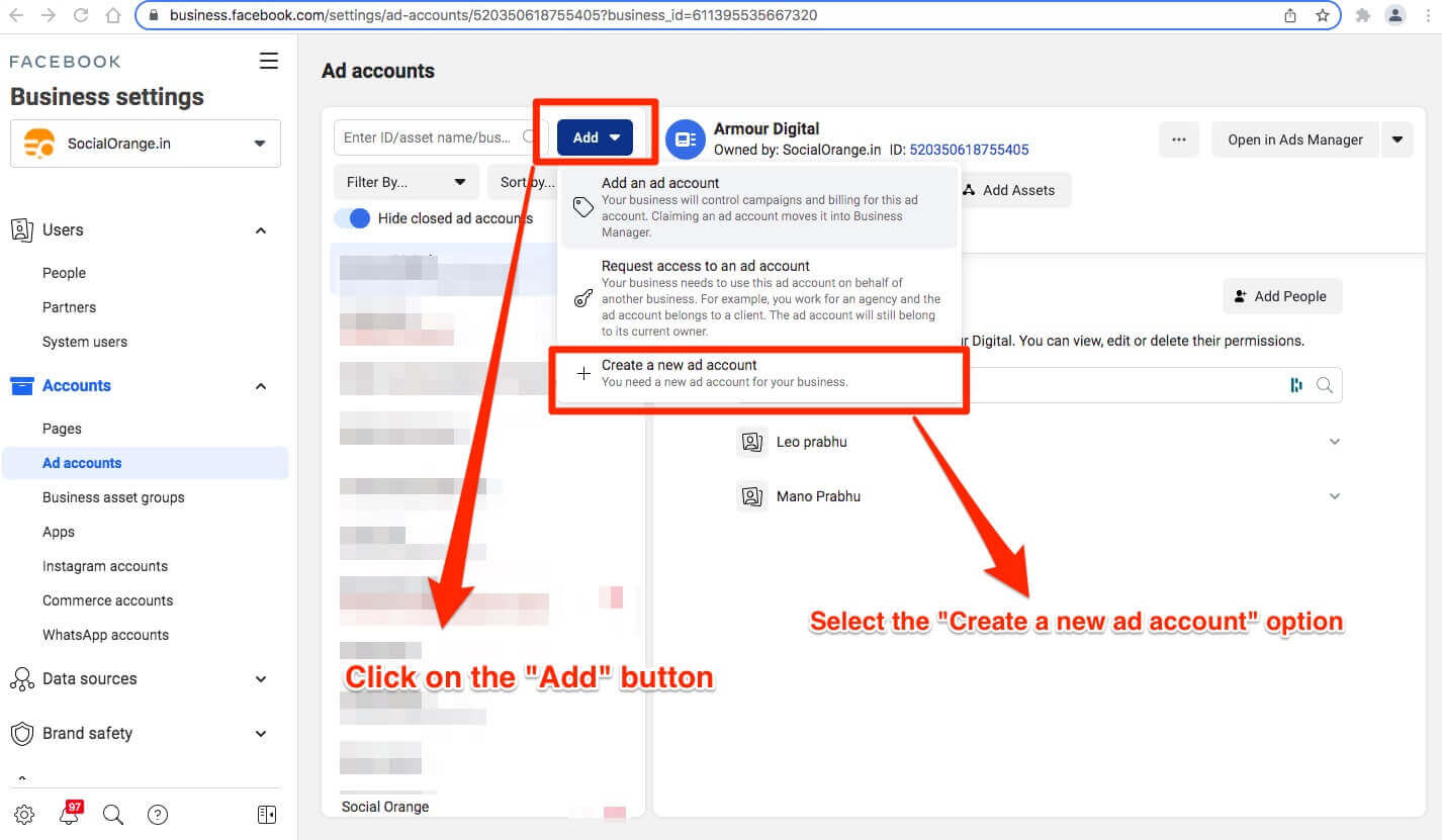Now, on the right-hand side you will see Add button with a little down arrow. Click on the button and your will see 3 options. Select create an ad account from that.