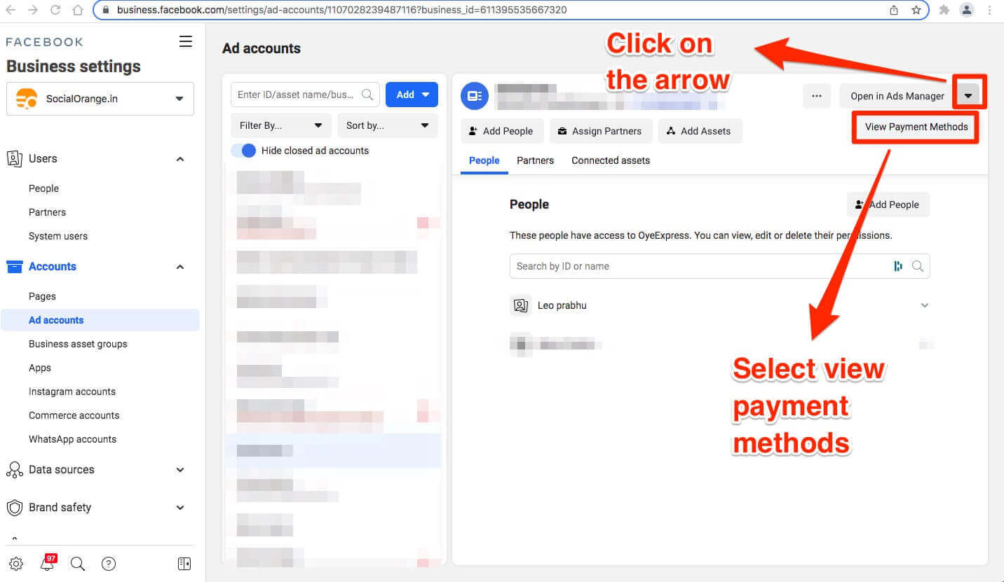 Open your business manager through which you created the ad account. Go to the newly created ad account. You will be able to see the button “Open in Ads Manager” button and a small arrow near that on the top right-hand side.