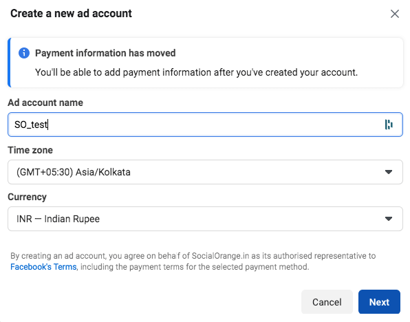 Then you need to enter your ad account name, currency and the time zone.