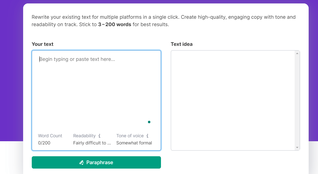 Simply enter your content in the input field, click on “Paraphrase”, and the tool will rewrite the given material in seconds while providing you additional information about your content.